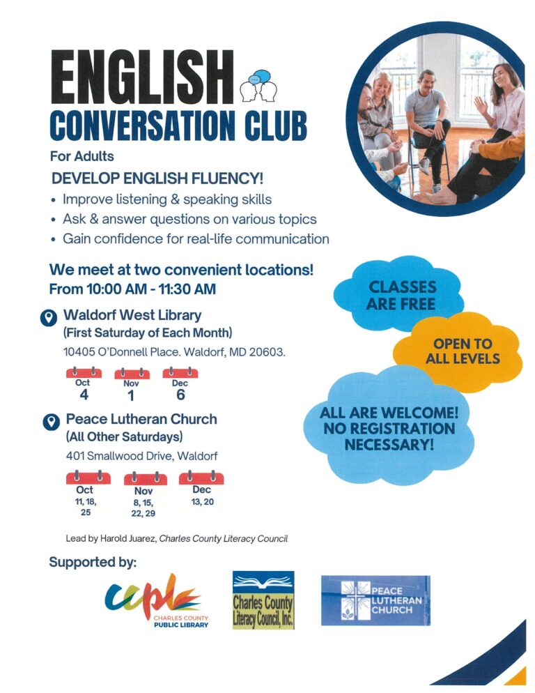 Meetings are every Saturday, from 10:00 AM to 11:30 AM. The first Saturday of each month at the Waldorf West Library (10405 O’Donnell Place. Waldorf, MD 20603) and the other Saturdays at the Peace Lutheran Church  (401 Smallwood Dr,, Waldorf, MD 20602). See you there!